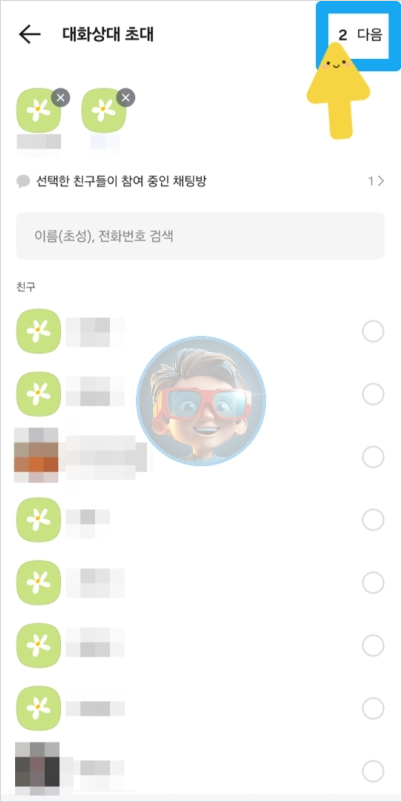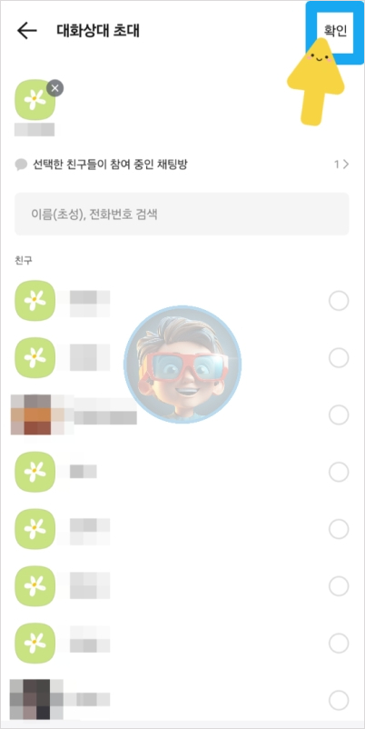 다음 단톡방에 초대할 친구들을 선택하세요. 최소 2명 이상 선택해야 단톡방이 생성됩니다. 대화 상대를 모두 선택한 뒤 상단에 있는 "확인" 버튼을 눌러주세요.