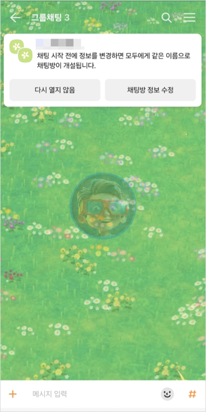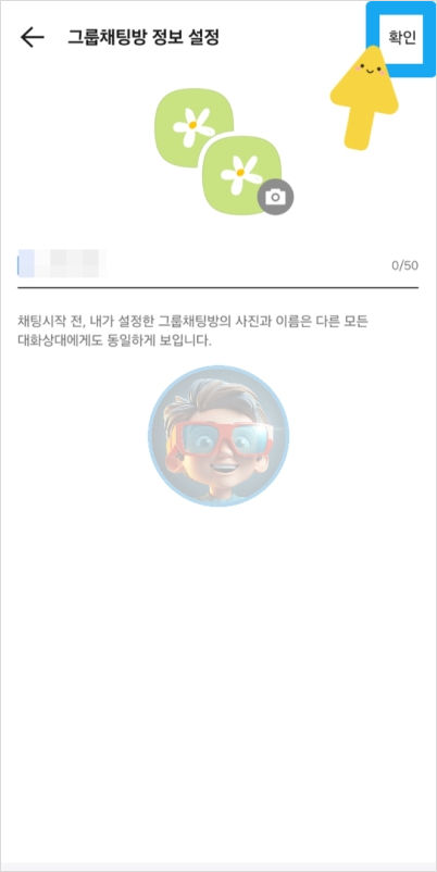 그리고 단톡방 이름과 이미지를 설정하면 대화방이 완성됩니다! 이름과 이미지를 정할 때 소소한 재미를 추가해보세요.