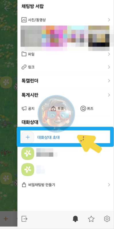 카톡방 왼쪽 상단의 메뉴 아이콘(≡)을 클릭 후 ‘대화 상대 초대’ 버튼을 선택합니다.