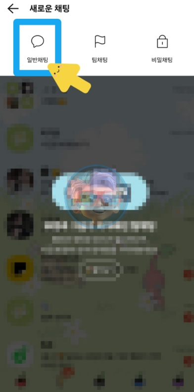 카카오톡 앱 실행 후 채팅 화면 오른쪽 상단에 있는 말풍선 아이콘을 클릭하면 새로운 채팅을 시작할 수 있는 메뉴가 뜹니다. 여기서 ‘일반채팅’을 선택하세요.