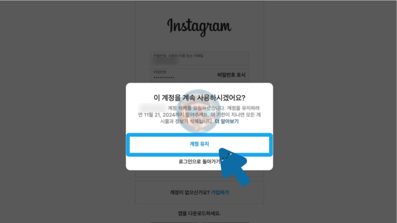 계정을 삭제한 후 30일 이내에는 복구가 가능합니다. 이 기간 동안 계정에 로그인하면 “계정을 계속 사용하시겠습니까?”라는 팝업이 나타나고, 여기서 복구를 진행할 수 있습니다.