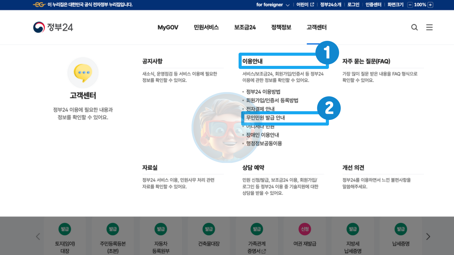 고객센터 클릭하시면 아래 이미지와 같이 여러 항목을 볼 수 있는데요. 먼저 "이용 안내" 클릭 후 "무인민원 발급 안내"를 클릭하시면 돼요