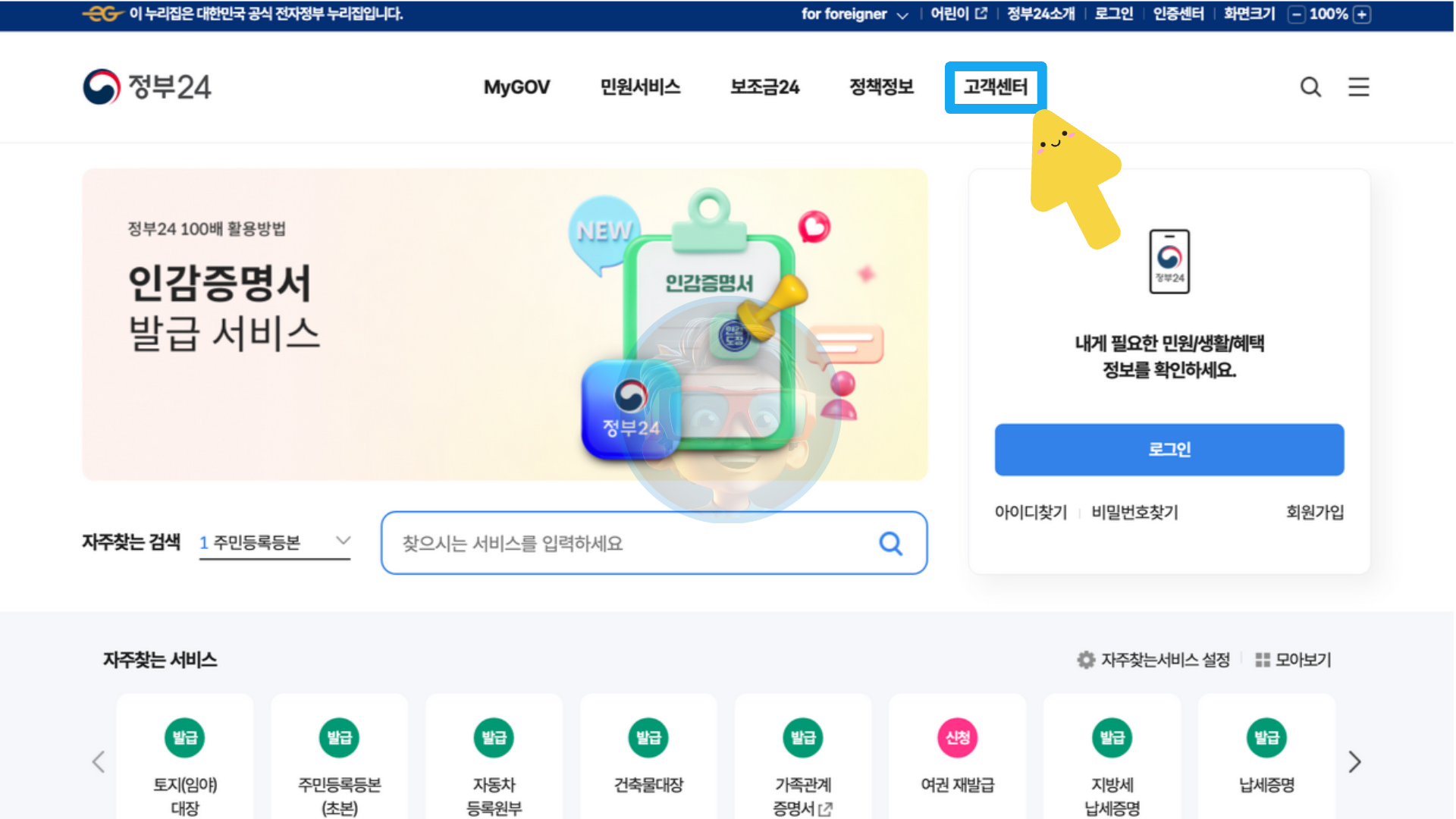 정부24 홈페이지에서 "고객센터"를 찾아 클릭하세요.