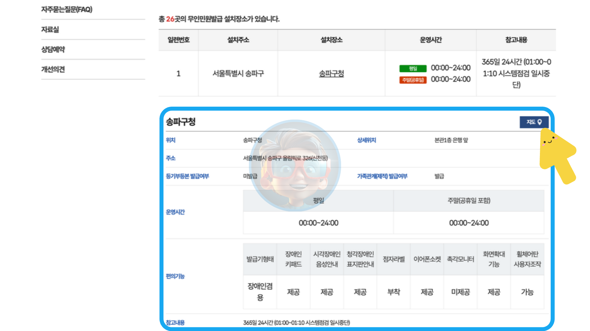 송파구청 발급기에서 제공하는 정보를 확인 후 저는 바로 발급을 하기 위해 "지도" 버튼을 클릭했어요.